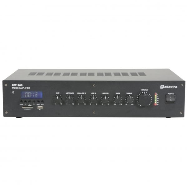 100V amplifiers with integral 5 channel mixer in a 2U rack-mountable housing. Inputs include a balanced XLR for microphone with switchable phantom power and Vox override, 2 mic/line jack inputs and 2 RCA line inputs, of which one can be fed from the internal USB/SD player with built-in FM tuner and Bluetooth receiver. Bass & Treble EQ and Master volume control the overall output, which can power either 8 Ohms or 100V line speakers. Generous features and versatility provide a comprehensive control centre for commercial sound installations.