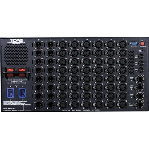 A rear panel "Mute All Outputs" button is provided for aiding in onstage re-patching. The unit is also equipped with dual-redundant, universal power supplies.